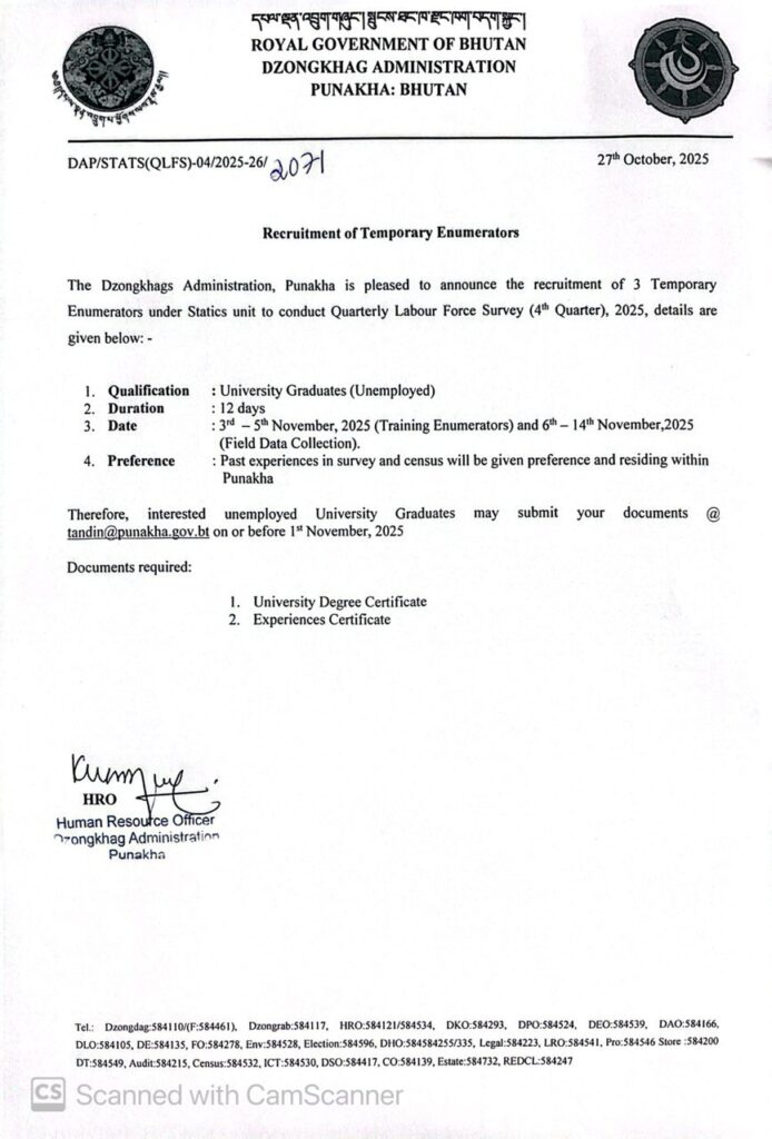 The Dzongkhags Administration, Punakha is pleased to announce the recruitment of 3 Temporary Enumerators under Statistics Unit to conduct Quarterly Labour Force Survey (4th Quarter), 2025, details are given below: –